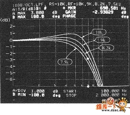 而現(xiàn)在還不清楚在電路中用于最平坦特性的正反饋量的計(jì)算步驟,所以可用實(shí)驗(yàn)來求得。圖3是C=0.01μF、RF=16kΩ(通常fc=1kHz),反饋電阻RF在7.5k~10kΩ變化時(shí)的頻率特性。標(biāo)識(shí)點(diǎn)為8.2kΩ的曲線被認(rèn)為是最平坦的反饋電阻值。