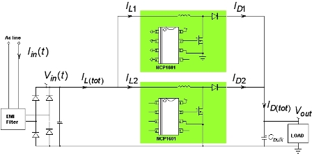 圖3:采用兩顆NCP1601 PFC控制器實現(xiàn)的交錯式PFC架構(gòu)的功能框圖。