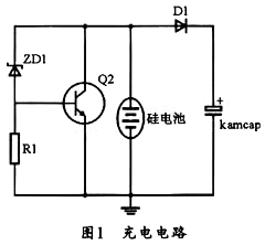 本系統(tǒng)中的充電電路由防過壓和防反充電路構(gòu)成,圖1所示為其充電電路,圖中的ZD1為5.6V穩(wěn)壓二極管,當(dāng)電池電壓高于5.6 V時,Q2導(dǎo)通,硅電池全部電流通過電阻Q2消耗掉,當(dāng)硅電池電壓降到5.6 V以下時,Q2截至,硅電池給超級電容充電,并同時保護(hù)超級電容。