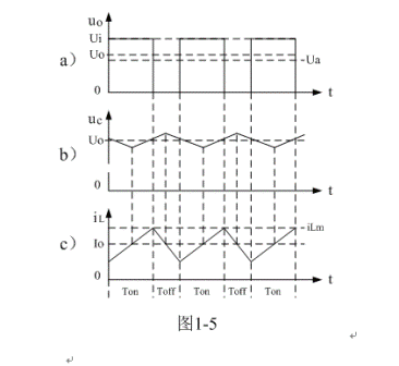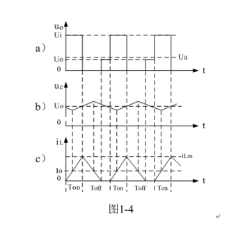 (3)當(dāng)Ui < 2Uo時(shí),即:濾波輸出電壓Uo大于電源輸入電壓Ui的一半時(shí),或控制開關(guān)K的占空比大于二分之一時(shí):在K接通期間,雖然流過儲(chǔ)能電感L的電流上升率(絕對(duì)值),小于,在K關(guān)斷期間,流過儲(chǔ)能電感L的電流上升率(絕對(duì)值)。但由于Ton大于Toff,(1-5)式中i(0)和(1-11)式中iLX均大于0,即:電感存儲(chǔ)能量每次均釋放不完。在這種情況下,流過儲(chǔ)能電感L的電流iL是連續(xù)電流,開關(guān)電源工作于連續(xù)電流狀態(tài),輸出電壓Uo的紋波比較小,且濾波輸出電壓Uo大于濾波輸入電壓uo的平均值Ua。參看圖1-5。