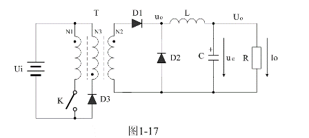 圖1-17是正激式變壓器開關電源的簡單工作原理圖,圖1-17中Ui是開關電源的輸入電壓,T是開關變壓器,K是控制開關,L是儲能濾波電感,C是儲能濾波電容,D2是續流二極管,D3是削反峰二極管,R是負載電阻。