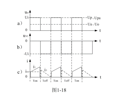 圖1-17中,在Ton期間,控制開關K接通,輸入電源Ui對變壓器初級線圈N1繞組加電,初級線圈N1繞組有電流i1流過,在N1兩端產生自感電動勢的同時,在變壓器次級線圈N2繞組的兩端也同時產生感應電動勢,并向負載提供輸出電壓。開關變壓器次級線圈輸出電壓大小由(1-63)、(1-69)、(1-76)、(1-77)等式給出,電壓輸出波形如圖1-18-a)。