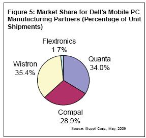 通常,Dell將個人移動PC制造交予Wistron,將企業移動PC制造交予Compal,Quanta則兩者兼有。圖中的數據顯示2008年Wistron為Dell完全制造的移動PC的份額超過了50%。