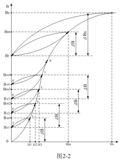 顯然,局部磁滯回線固定于什么位置,對某種材料來說只取決于?B值的大小。如果?B足夠大,則局部磁滯回線的最低點位于最大局部磁滯回線的剩余磁通密度點Br點處。此時Br對應每個輸入直流脈沖的起點,Bm對應每個直流脈沖的終點。