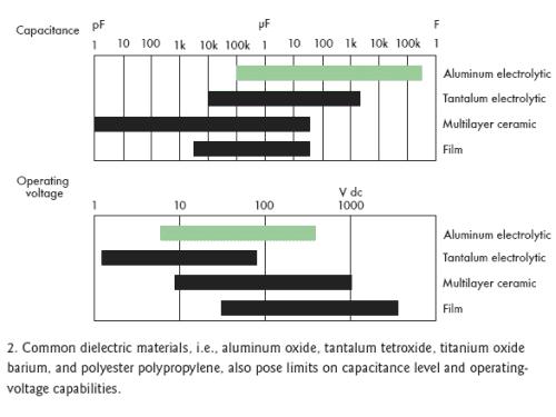 標準電容的結構是在兩個附屬于金屬板上的電極之間夾一層電介質層(圖1)。根據電容類型不同,電介質可以是氧化鋁、四氧化鉭、氧化鈦鋇或聚丙烯聚酯,不同的材料決定了不同的容量和電壓特性(圖2)。電介質的多少和極板間的距離也會影響電容量。然而,極板間最大允許距離限制了電介質的數量。