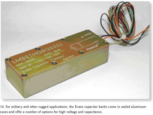 EvansCapacitor公司的3STHQ3和3PTHQ3電容組器件則主要用于任務繁重的軍事應用,它將公司的三個THQ3混合電容集成進了一個陽極電鍍、環氧密封的鋁殼中,整個尺寸為4.47×1.59×1.09英寸(圖10)。針對更高的工作電壓,3STHQ3組可以串聯電容的方式提供以下四種產品:0.004F/160Vdc,0.0028F/200Vdc,0.0019F/250Vdc和0.0011F/300Vdc。