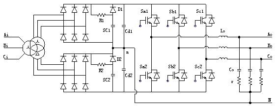 圖中,SC為超級電容(SuperCapacitor),R為SC充電電阻,D為SC放電二極管,Cd為直流平波電容器,Sa~Sc為IGBT器件,L0及C0為輸出濾波器的電感和電容。交流輸入側采用Y/Y/D接線的三繞組輸入變壓器及兩組三相不控整流電路構成12脈波整流系統,注入系統的諧波電流次數為12k±1,數值高,因此在無特殊要求場合,不用考慮設置濾波電路。
