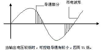 而當輸出電壓Uo很低時,可控硅導通角很小,絕大部分市電電壓被可控硅“卡斷了”(如下圖所示),只讓很低的電壓加在變壓器初級,即Ui很低,這當然經整流濾波后輸出電壓也就很低了。