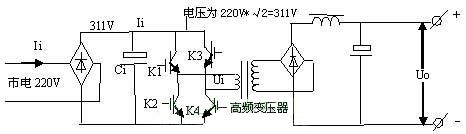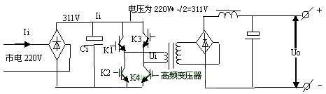 由電路可以看出,市電經整流濾波后變為311V高壓,經K1~K4功率開關管有序工作后,變為脈沖信號加至高頻變壓器的初級,脈沖的高度始終為311V。當K1,K4開通時,311V高壓電流經K1正向流入主變壓器初級,經K4流出,在變壓器初級形成一個正向脈沖。