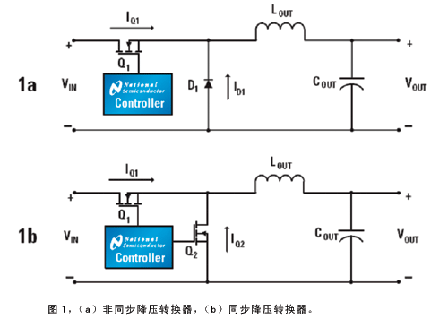 圖1是非同步和同步降壓轉(zhuǎn)換器的原理圖。非同步降壓轉(zhuǎn)換器使用FET和肖特基二極管作為開關(guān)器件(圖1a),當(dāng)FET打開時,能量傳遞到輸出電感和負載。當(dāng)FET關(guān)斷,電感中的電流流過肖特基二極管。如果負載電流高于輸出電感的紋波電流的一半,則轉(zhuǎn)換器工作在連續(xù)導(dǎo)通模式。