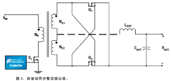 自驅(qū)動方案是最簡單、直接的SR驅(qū)動方案(圖3),適合于那些在任何時間段內(nèi)變壓器電壓都不為零的拓撲結(jié)構(gòu)。兩個SRFET可替代輸出整流二極管,次級繞組產(chǎn)生的電壓驅(qū)動SR的柵極。在大多數(shù)情況下,利用不同的變壓器線圈匝數(shù)比(NP∶NS1∶NS2)和正確選擇SRFET,相同的拓撲結(jié)構(gòu)可以獲得更高或更低的輸出電壓。
