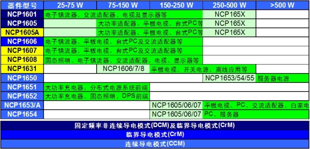 安森美半導(dǎo)體提供豐富PFC控制器選擇,如NCP1601/5/6/7/8、NCP1631、NCP1650/1/2/3/4等,涵蓋上述不同工作模式,優(yōu)化用于不同功率的應(yīng)用,見表1。如NCP1606/7/8采用CrM工作模式,適合于功率通常低于300W的中等功率應(yīng)用,如電子鎮(zhèn)流器、液晶電視、等離子電視、臺式計算機和交流適配器等。最新推出的NCP1654均工作在CCM模式,適用于功率大于200W以上的場合。NCP1654的前身NCP1653推出幾年來已經(jīng)獲得了極大的成功,廣泛應(yīng)用于臺式計算機,開放式電源等領(lǐng)域。特別是在液晶電視和等離子電視中更是占據(jù)了絕大多數(shù)的市場份額。