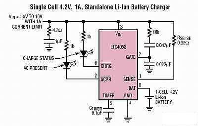 LTC4052需要一個(gè)電流受限的墻上適配器,以控制充電電流的大小。它還需配備過(guò)流保護(hù)電路,以便在意外使用較高電流或墻上適配器發(fā)生故障時(shí)能提供保護(hù)。LTC4052是一款全集成的脈沖充電器,無(wú)需使用外部MOSFET或阻流二極管(見(jiàn)圖3)。這款獨(dú)立的充電器IC具有C/10檢測(cè)、充電狀態(tài)指示、充電結(jié)束定時(shí)器、墻上適配器檢測(cè)及過(guò)流保護(hù)等功能。LTC4052的輸入電源可以是4.5V到12V,并具有1%的飄移電壓精度。