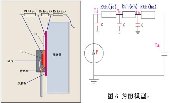 圖5為TO-220典型的安裝結(jié)構(gòu)及熱模型。熱阻與電阻相似,所以我們可以將Rth(ja)看著幾個小的電阻串聯(lián),從而有如下公式: