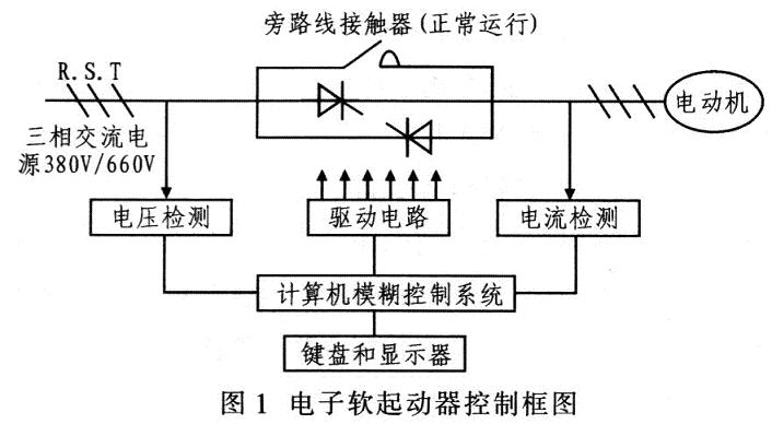 軟起動有磁控降壓軟起動器和電子軟起動器。其中,磁控降壓軟起動采用控磁限幅調壓方式減壓調控電動機起動時的電壓,實質就是電抗器降壓起動。電子軟起動器有晶閘管調壓軟起動和變頻器調速軟起動。晶閘管調壓軟起動器的主回路采用6只晶閘管兩兩反向并聯組成的調壓電路,并焊接于電動機的三相供電線路。當起動器的微機控制系統接收到起動指令后進行有關計算。輸出晶閘管的觸發信號,通過控制晶閘管的導通角起動器按所設定的模式調節輸出電壓,從而控制電動機的起動。當電動機起動完成后,起動器吸合旁路線接觸器,使晶閘管短路,電動機直接投入電網運行,避免不必要的電能損耗。圖1為電子軟起動器控制框圖。