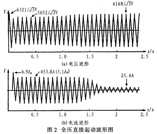 圖2為全壓直接起動的電壓、電流波形。由圖2(a)電壓波形可見,電動機起動前系統電壓為