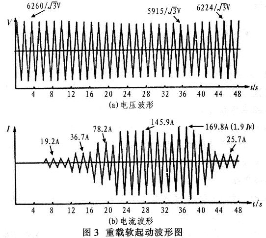 圖3為重載軟起動的電壓、電流波形。從圖3(a)電壓波形可見,電動機起動前系統電壓為