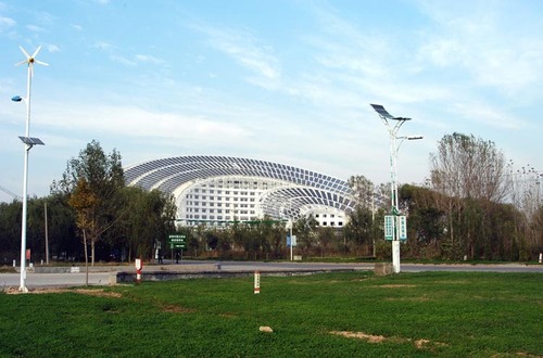 “日月壇-微排大廈”是2010年第四屆世界太陽城大會的主會場。它把太陽能綜合利用技術與建筑節能技術相結合,不但完善了太陽能應用技術標準體系、研發了一批具有自主知識產權的太陽能系列產品,還為太陽能規模化推廣應用提供了寶貴的技術支持,整體突破了普通建筑常規能源消耗巨大的瓶頸,綜合應用了多項太陽能新技術,如吊頂輻射采暖制冷、光伏發電、光電遮陽、游泳池節水、雨水收集、中水處理系統、滯水層跨季節蓄能等技術,使多項節能技術發揮應用到極致。