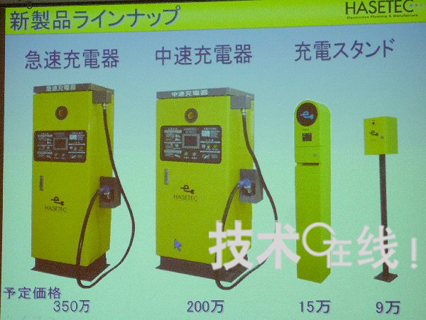 “快速充電器在電動汽車的普及中不可或缺。作為最先開發出快速充電器的企業,我們將繼續積極努力”,Hasetec代表董事社長千村正如此表示。該公司日前擴充了電動汽車用充電器的產品陣容。除改進了原來的快速充電器外,還新開發出了一款中速充電器和兩種充電站。價格方面,快速充電器為350萬日元,中速充電器為200萬日元,充電站分別為15萬日元和9萬日元。
