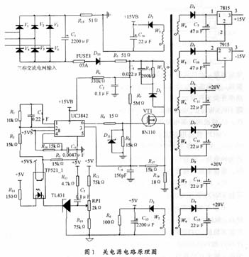 +15V電源和-15V電源對控制電路電源精度要求較高,但因為共用同一個變壓器很難通過PWM實現反饋控制來穩壓。為獲得高品質的控制電源,應用線性穩壓芯片7815和7915(如圖1所示)構成了復合式開關穩壓電源。為防止輸出在輕載或空載時的電壓升高,在5 V整流輸出端并聯一個100Ω的負載電阻。