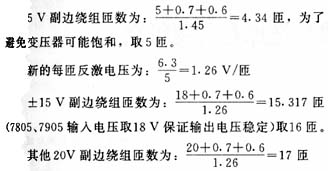 高頻變壓器的副邊繞組W6,W7,W8提供了三相逆變器3個上橋臂元件的驅動電源,W9提供了下橋臂3個元件的驅動電源(亦可用3個繞組分別提供,以避免交叉干擾,此處只用一組是為了簡化系統)。按逆變器開關元件對驅動電路電壓、電流的要求確定功率。本電機控制功率變換器功率模塊為IGBT,驅動模塊為EXB841。選定W2,W3,W4電壓20V,電流100mA;W5電壓20V,電流200mA。W6,W7繞組提供其他模擬電路±15V,300mA電源。W8繞組提供5V給微處理器,輸出電流為2A。W2為開關電源自身的反饋繞組,其功率很小,可忽略。