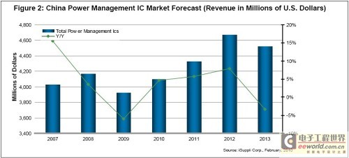 下圖所示為iSuppli公司對(duì)中國(guó)PMIC營(yíng)業(yè)收入的預(yù)測(cè)。