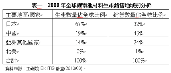 在生產(chǎn)與銷售地區(qū)上,在2009年仍然呈現(xiàn)集中于亞洲的態(tài)勢(shì),其中日本仍為最主要的正極材料生產(chǎn)與銷售大國(guó),雖然在日本國(guó)內(nèi)因生產(chǎn)成本高漲之故,鋰電池的制造出口逐年下降中,但至今全球仍有近67%的鋰電池正極材料在日本生產(chǎn),中國(guó)與其他亞洲地區(qū)僅占19%與14%。至于在銷售地區(qū)分布上,由于下游的電池大廠仍以日商為多,因此日本仍為銷售地區(qū)比例最高的國(guó)家,其他依序?yàn)橹袊?guó)、其他亞洲地區(qū)、北美等地。