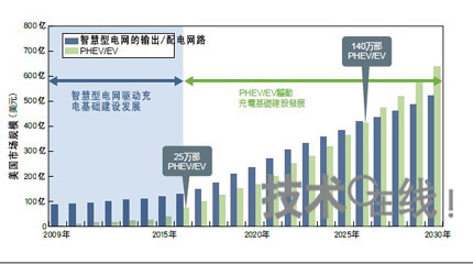 美國的充電基礎設施一開始將慢慢地隨著智能電網市場成長,而非PHEV/EV市場。智能電網的傳輸和分配網路升級的市場規模預估是依Morgan Stanley的資料製成。PHEV//EV市場規模是依據EPRI市場滲透率來預估,以每臺30000美元換算。