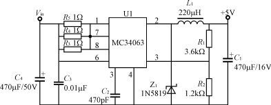 如果保證在最低輸入電壓70%Rn時電表能輸出正常的工作電壓,按線性變壓器特性,則在額定輸入電壓Un時,輸出電壓會較高,如果輸出電壓整流濾波后采用一般的線性穩壓器供電,將會使整機功耗加大;而在最高輸入電壓時,將會使變壓器溫升增大,線性穩壓電路損耗加大,發熱量也會增大;針對整機耗電較大的電子電度表,其解決辦法一是可以采用較好材質的硅鋼片,如Z11型硅鋼片;二是低壓輸出穩壓電路采用一個低成本的高效率DC/DC變換電路,即可使整機功耗顯著降低,還可在寬輸入電壓范圍內,穩定、高效地工作。這些DC/DC電路可以采用簡單的低成本MC34063、LM2574等DC/DC變換器,采用MC34063設計的+5V輸出DC/DC變換器如圖3所示。