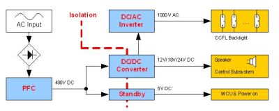 DC/AC逆變電源用于驅動背光模組,其將DC/DC主電源輸出的24V或12V直流電壓轉換為1000V左右的高壓交流電壓用于驅動背光CCFL燈管并實現背光亮度(燈管電流)的調節功能,LCDTV顯示畫面的對比度需依靠高亮度的背光來支撐,所以DC/AC逆變電源部分的輸出功率通常占整機總輸出功率的70%以上,且尺寸越大,背光功耗所占比重越大。