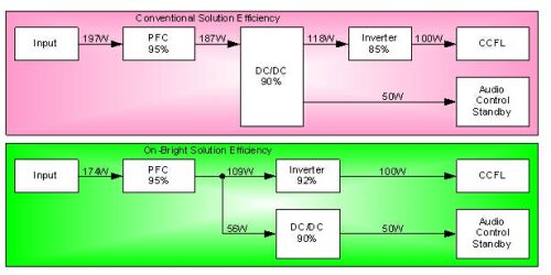 圖6以150WLCDTV電源為例來對比傳統方案與昂寶電子方案,假設背光滿載消耗100W,其它部分滿載消耗50W,按照常規架構及各模塊轉換效率來推算,運用傳統方案來設計,其理論輸入功率將達到197W左右,整體效率為76%,而使用昂寶電子的方案來設計,理論輸入功率只需要174W左右,整體效率高達86%。