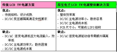 表4:傳統LCDTV電源方案與昂寶電子方案優缺點的比較。