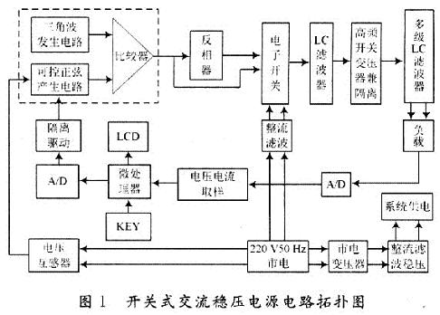 電壓和電流取樣電路從負載上獲取電壓和電流信號,分別送兩路A/D轉換器轉換,變成離散的數字信號。一方面用于通過微處理器處理后進行實時顯示;另一方面用于通過微處理器處理后送D/A轉換器變換為模擬量,經過光電隔離驅動電路來控制正弦波發生器的幅值,又經過比較器、反向器、高速電子開關、LC濾波、高頻開關變壓器、多級LC濾波等電路,用于控制負載上電壓或電流的穩定。電壓互感器的作用是從市電中獲得低諧波失真的標準正弦波,經由正弦波產生電路控制其幅值;鍵盤用于輸入準備向負載提供的電壓或電流值。