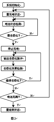 整個系統的控制過程為:蓄電池組開始充電一段時間后,檢測電池電壓,當達到電池出氣點電壓(約2.4V/單體)時,停止充電,然后進行大電流(約2C)放電去極化,時間為1ms,充放電曲線如圖3所示。放電后,再檢測電池狀態,進行去極化效果檢測,達到去極化效果則回轉充電,否則,再次進行去極化放電,直至達到去極化要求的效果才回轉充電。如果連續放電n次(n=3),電池電壓變化很小,則充電完成并結束充電狀態。