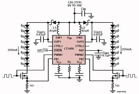 為了實現這些LED剎車燈的性能和工作壽命的最大化,應采用一種能夠驅動這些剎車系統所需的紅光LED串的合適LED驅動器,這是必不可少的。凌力爾特的LT3486便是專為此類汽車應用而開發的。LT3486是一款雙通道升壓型DC/DC轉換器(如圖2所示),專為從一根12V至14V汽車總線以恒定的電流來驅動多達16個LED(每個轉換器驅動8個串聯LED)而設計。采用LED串聯的方式能夠提供相等的LED電流,從而獲得均勻的LED亮度。在需要的時候,兩個獨立的轉換器還能夠驅動不對稱的LED串。