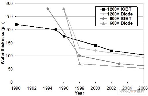 由于導通電壓和關斷損耗在很大程度上取決于晶圓的厚度,因此需要做更薄的IGBT。圖4顯示了英飛凌600/1,200VIGBT和EMCON二極管的晶圓厚度趨勢。對于新型1,200VRC-IGBT而言,120um厚度晶圓將是標準工藝。這需要進行復雜的晶圓處理,包括用于正面和背面的特殊處理設備。將晶圓變薄可通過晶圓打磨和濕式化學蝕刻工藝實現。