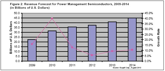 預計總體電源管理半導體市場增長率約為15%,主要受筆記本市場、服務器基礎設施替換和替代能源需求驅動。混合動力與電動汽車、風能和太陽能以及電網升級,帶來替代能源的電源管理半導體需求。另外,iSuppli公司認為,使用半導體的電子產品和工藝的效率明顯改善----從電動工具到叉車,從火車到汽車,可以看成是電源管理的一個新興趨勢。