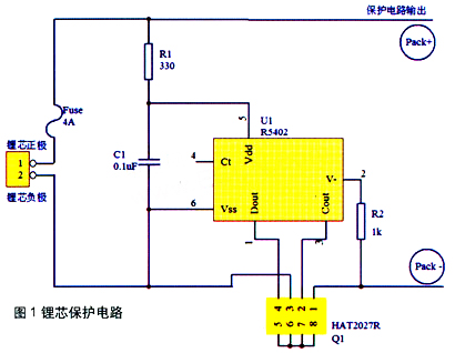 如圖1所示,電芯保護電路主要由R5402和HAT2027共同組成。除此之外,自恢復保險絲起到了最后一層保護的作用。