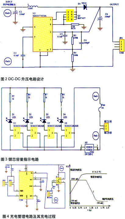本文論述的電路系統設計由五部分組成:鋰芯容量指示電路、電芯保護電路、充電管理電路、DC-DC升壓電路和功能擴展電路。鋰芯容量指示電路由XC61CC系列的電壓監控芯片組成。電芯保護電路由過充保護、過放保護、過溫保護三部分組成,HAT2027、R5402、自恢復保險絲構建了三重保護,使鋰芯安全性大大增強。充電管理電路采用了CN3066,將充電過程分為涓流充電、恒流充電、恒壓充電和維護充電四個部分,使移動隨身電源能夠最大程度地儲備能量。DC-DC升壓電路采用了MAX1771集成芯片,可將鋰芯容量在安全范圍內最大限度釋放,達到對多種數碼設備供電的目的。功能擴展涵蓋了戶外活動所涉及的常見需求,具有應急夜間高亮照、戶外防盜安全警報、野營驅蚊等功能。