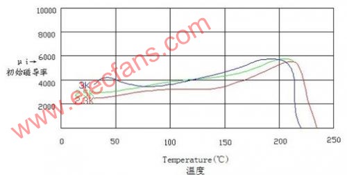 我們用另外一幅圖來說明節(jié)能燈常用的幾種磁環(huán)的磁性材料初始磁導(dǎo)率的溫度特性曲線.