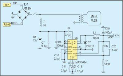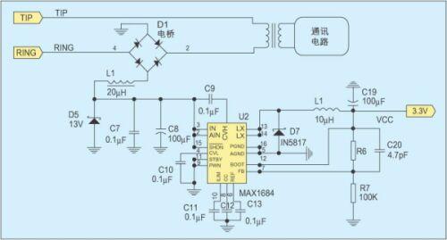 摘機饋電電路大致分為兩類,饋電電路與通訊電路并聯的屬于并聯饋電,饋電電路與通訊電路串聯的屬于串聯饋電。圖2是一種常用的并聯饋電電路,大電感L1保證直流饋電不會影響交流信號。對于惡劣的線路狀況,如5km長的用戶線路,若不考慮通訊電路的影響,齊納管D5上的電壓最大為15V,功率可達340mW。當線路狀況更加惡劣時,將齊納管D5上的電壓降低到13V,則可獲得300mW左右的功率。利用MAXIM公司的開關頻率為600KHz,效率可達95%的高效DC/DC轉換器MAX1685,將這個電壓轉換成3.3V就可獲得85mA的電源電流。