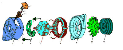 11管交流發(fā)電機的整流器由8只大功率整流二極管(其中2只中性點二極管)和3只磁場二極管組成。其它結(jié)構(gòu)和6管交流發(fā)電機相同。