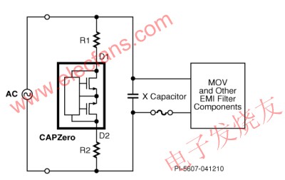 CAPZero可以有效隔離電阻R1和R2,使設計師能夠自由優化C1、L1和其他輸入濾波元件的值。在增大X電容值同時不增加功耗的情況下,可以進一步減小共模/差模扼流圈的值,甚至省去此類元件。這樣不僅能節省空間和成本,而且還可以提高電源效率。