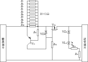 在圖8中,R1—R10為1Ω的標準電阻,功率為2W,當電流超過預定值時,在并聯電阻上的壓降超過0.7V,三極管導通,此時,MOSFET將因柵源極間承受反向電壓而截止,從而切斷主電路;當電流值正常時,MOSFET正常導通,不會影響電路的正常工作。這種電路的缺點在于,如果電路中出現時斷時續的過電流時,MOSFET將會不斷地動作。為此,在圖3中還加入了其他保護元器件。