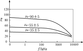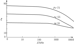 共模電感是完全對稱、線圈匝數相同的兩個電感線圈,繞在同一個鐵心上,電流同方向流經兩組線圈后,根據右手螺旋法則,在電感鐵心內產生兩個方向相反的磁場,由于流經電流大小,線圈匝數完全相同,磁場強度強弱相當,因而完全抵消,不存在磁飽和問題,主要是要考慮電感鐵心材料的初始磁導率μo,對于這類材料的μo越高越好,通常有高μo系列的鐵氧體磁心,μo=4×103,6×103,8×103,1×104等類型,鐵基超微晶材料μo≥5×104,坡莫合金系列如1J79,1J851系列,μo≥5×104。在選擇金屬磁性材料時必須注意頻響問題(見圖3)1J79或1J851系列的磁心μo隨頻率上升而下降的幅度比較大,越薄的材料,μo隨頻率下降的幅度比較小,設計時應注意這一點。