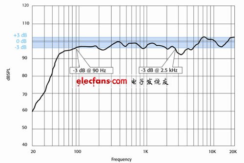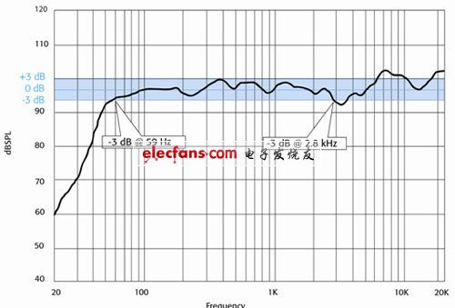 如果說+/-3dB所表示的是平坦特性,而不是頻率響應(yīng)范圍,那么這個參數(shù)對頻率特性而言還有什么意義?回答這個問題前我們可以看一下制造商在典型揚(yáng)聲器說明書上所標(biāo)注的“+/-3dB頻響。”