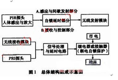 從圖l可知,系統分成了兩個彼此獨立的部分,即感應人體信號、經處理后實現信號的間隔發射部分,和接收處理后與插座連接的部分。其中感應與間歇發射部分,可設計制作成一個小巧、且具有一定藝術造型的裝飾品,放置于室內人員相對固定的場所旁邊,如辦公桌、飲水機、空調等處。考慮到人體紅外感應接收人體信號的范圍和方向性,系統應用了 雙PIR探頭,同時運用了無線收發射技術。