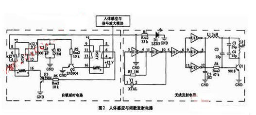 無線發射電路:電路由左邊延時部分觸發接通。電路由CD4069六反相器中的A、B、電阻R5、晶振組成高頻振蕩器,C、D、E、F分別組成整形及驅動電路,信號經三極管9018放大,再經L2、C1、C4諧振后向空中發射。