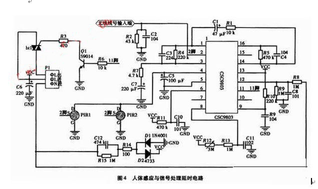 電路主要包括了電源電路、人體熱釋電紅外線傳感器、信號處理芯片、控制及執行電路等部分。電源電路通過阻容(R15和C12)降壓,并經過D1、D2整流,將220 V交流電轉換成可供芯片及外圍電路工作的低壓直流電(4.0 V~5.5 V)。CSC9803芯片工作電壓為直流4.O V~5.5 V,內置穩壓3.1 V輸出直接驅動PIR管。人體紅外釋熱傳感器PIR探頭感應到信號經CSC9803芯片內部放大,若判斷有觸發,運放輸出高電平,防止誤觸發。控制信號由 芯片的11腳輸出,經三極管放大控制雙向可控硅導通,從而控制外部交流接觸器或繼電器電磁線圈持續接通。