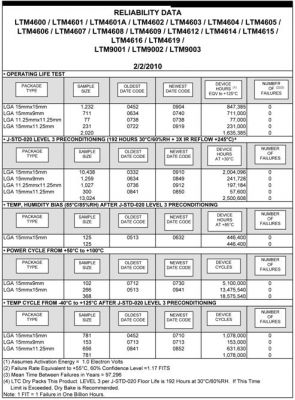 總共就DC/DC微型模塊產品進行了18項測試,其中有幾項測試是在不同溫度情況下進行的。這些數據是累計的,即自這些產品3年半以前推出以來,凌力爾特公司一直在監視和更新這些數據。凌力爾特公司嚴格更新這份報告,而且可在線提供報告副本。要求報告副本并無需滿足任何特殊要求。凌力爾特公司以這種方式支持其高性能微型模塊產品線,其中包括DC/DC系列(除了DC/DC產品,還提供混合信號微型模塊器件,如LTM9003和LTM2881)。